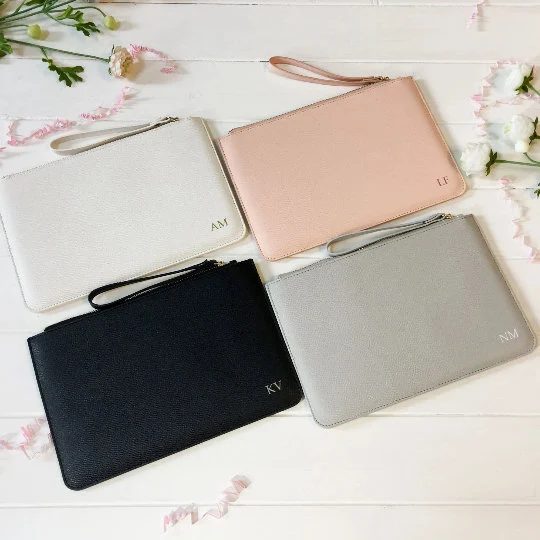 Made from a soft vegan leather, with a textured saffiano finish, gold metal zip and finished with a wristlet strap.