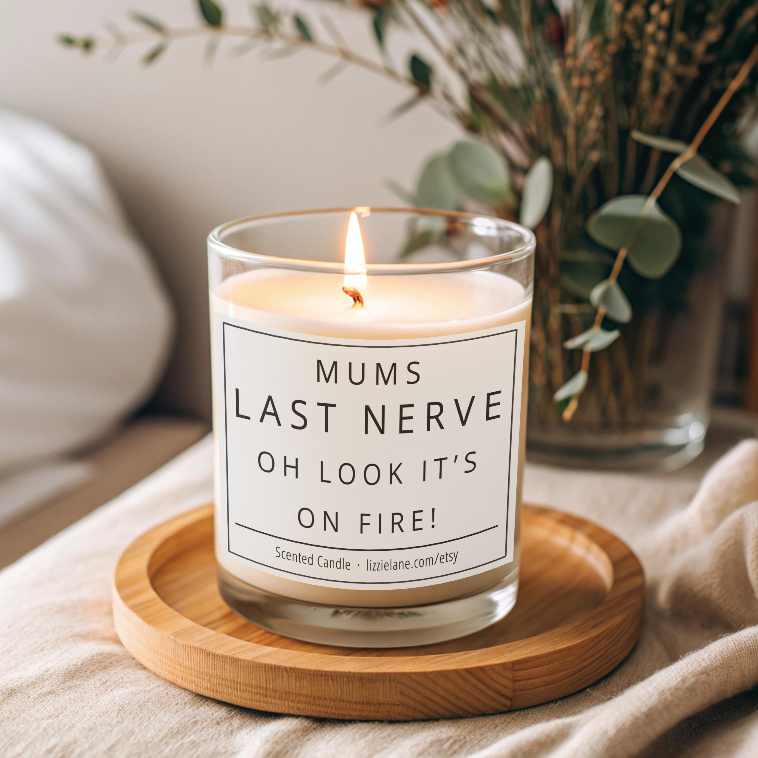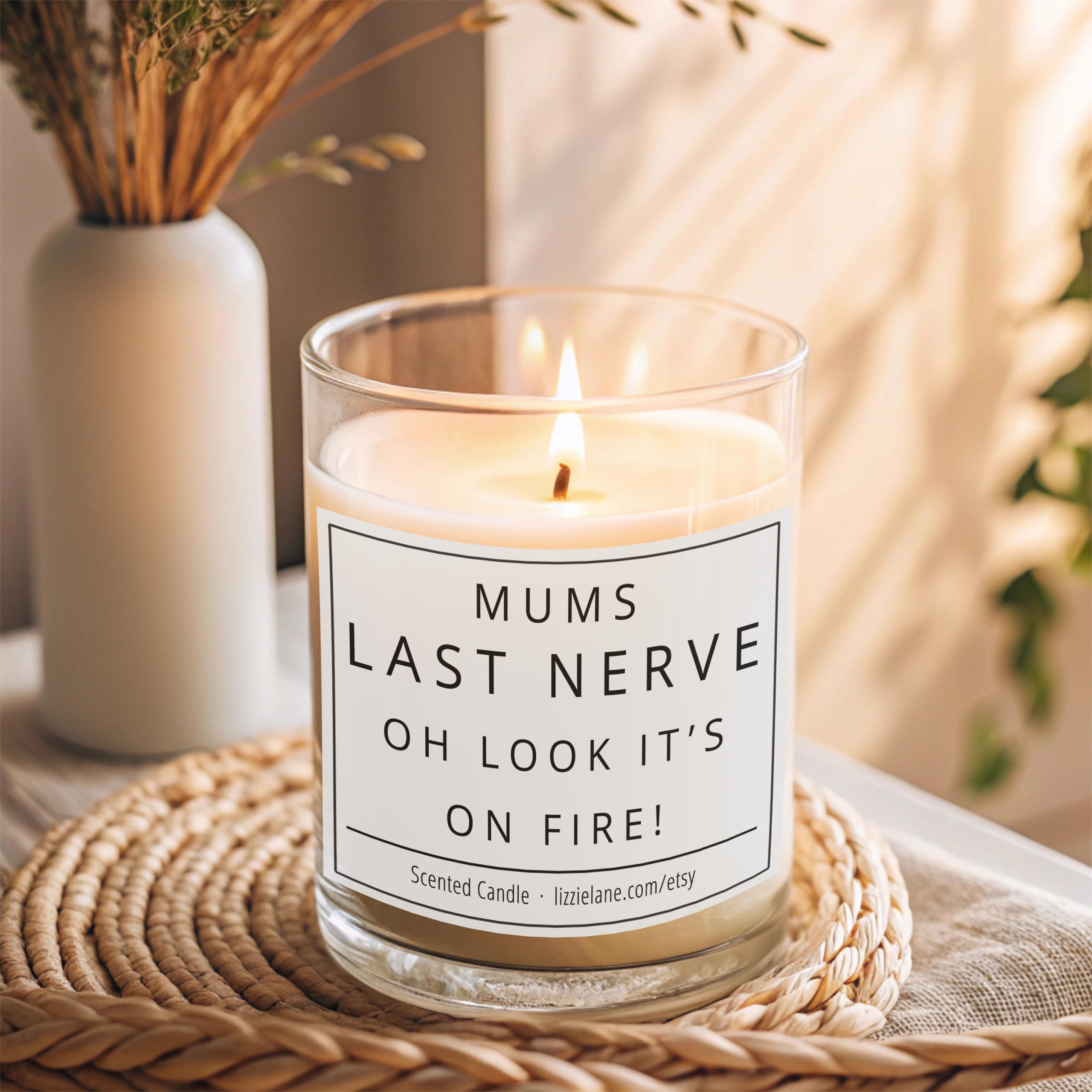 Candle with “Mums Last Nerve” label